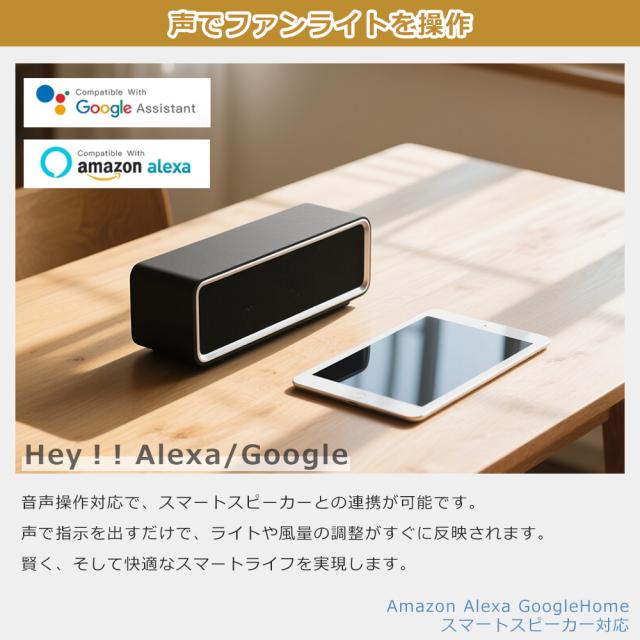 - 弊社のLEDシーリングファンライトは、アレクサやグーグル アシスタントを使用して、音声で簡単に操作できます。ライトのオン/オフ、明るさや色温度の調整など、手を使わずに快適に操作可能です。忙しい時や手がふさがっている時にも、声だけで家電をコントロールでき、より便利でスマートな生活を実現します。