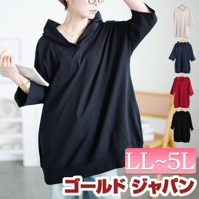 春新作 大きいサイズ レディース トップス パーカー チュニック ストレッチコットンチュニックパーカー ロング フーディー フード 5分袖 7分袖 コクーン ストレッチ 無地 ゆったり 夏服 秋服 春服 LL 2L 3L 4L 5L ブラック 黒 グレー ネイビー レッド 赤 ゴールドジャパン