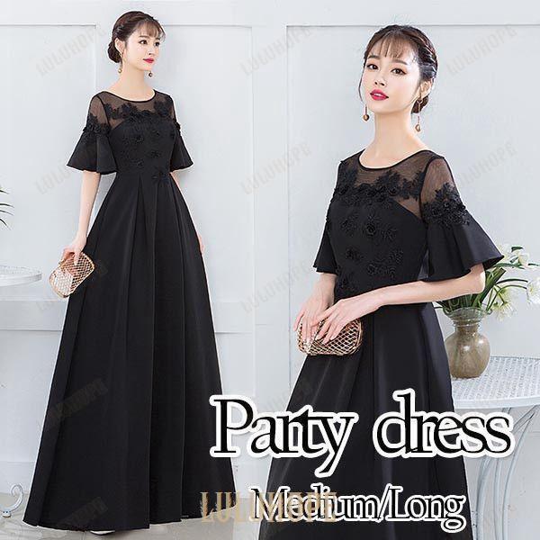 ロングドレス 演奏会 着痩せ パーティードレス ブラック 黒 レディース ロング丈 結婚式 母親 ドレス お呼ばれ 袖あり 大人 ピアノ 発表会 大きいサ