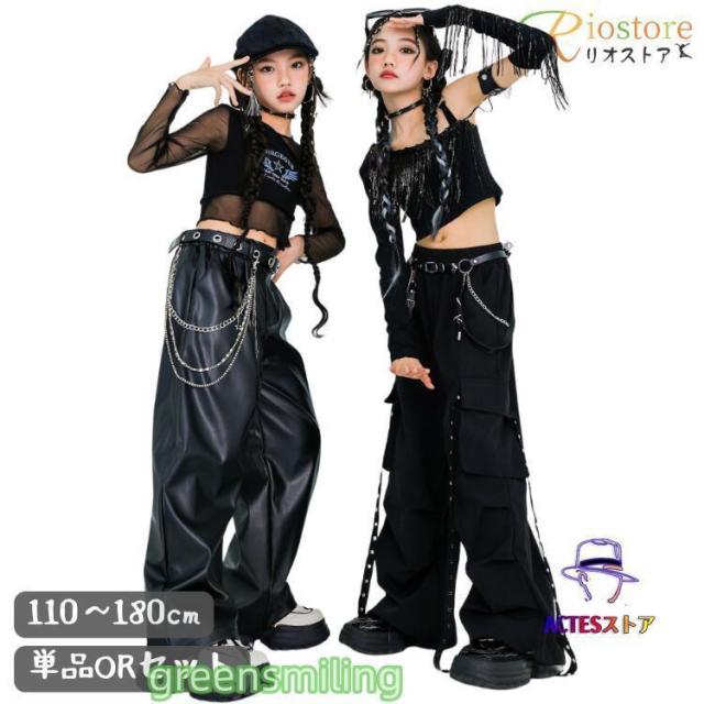 ダンス 衣装 キッズ セットアップ 黒 トップス へそ出し 袖カバー付き ズボン レザー 革ジャン カーゴパンツ カッコイイ チアガール ダンス衣装 k-pop