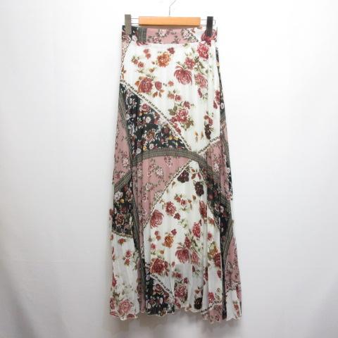 【中古】リエディ Re:EDIT 花柄 プリーツ シフォン マキシ ロング スカート M オフホワイト×ピンク バックゴム
