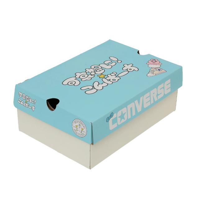 描きおろしのロゴを使用したインソール、キャラクターとオールスターが組み合わさった描きおろしのイラストが入ったオリジナルカートンを採用。