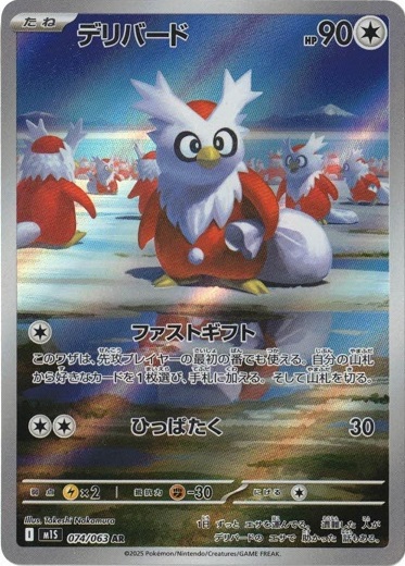 収録:メガシンフォニア コレクションナンバー:074/063 種類:ポケモン タイプ:無 カード名:デリバード レアリティ:AR