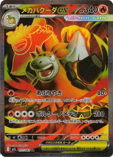 収録:メガブレイブ コレクションナンバー: 077/063 種類:ポケモン タイプ:炎 カード名:メガバクーダex レアリティ:SR