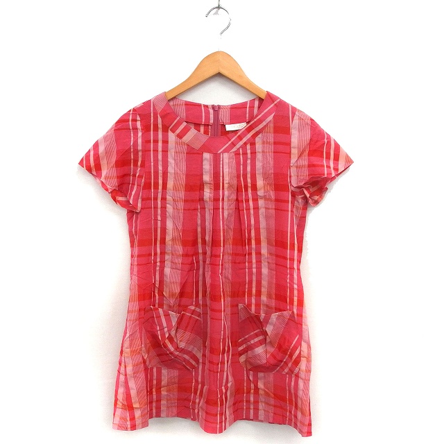 【中古】スチェッソ SUTSESO チェック チュニック 透け感 タック ラウンドネック バックジップ 半袖 42 赤 レッド