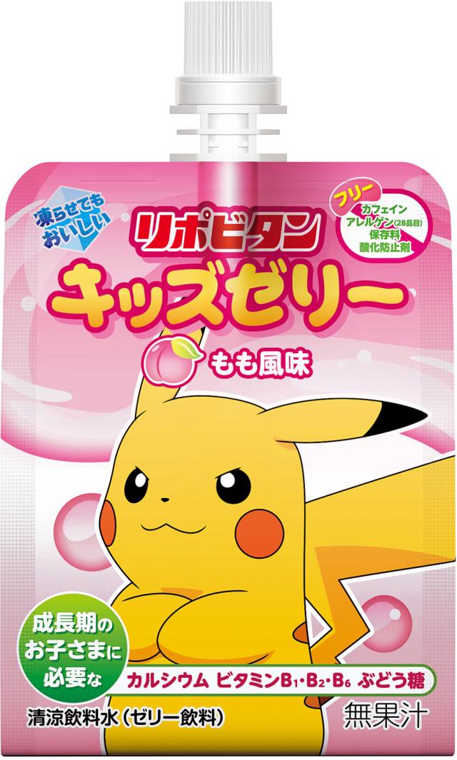 おやつにも栄養を!リポビタンキッズゼリー もも風味は、成長期のお子さまに必要なカルシウム、ビタミン B1 ・ B2 ・ B6 、ぶどう糖、乳酸菌を配合した、もも風味の美味しいゼリー飲料です。熱中症対策※にも適しており、凍らせてもおいしくお召し上がりいただけます。保存料・酸化防止剤・アレルゲン( 28 品目)・カフェインが全てフリーです。ポケモンデザインの全 6 種類のパッケージです。※本製品は全国清涼飲料連合会が定める[熱中症対策]表示ガイドラインの適用範囲[ナトリウム濃度として、少なくとも飲料 100ML あたり 40 〜 80MG 含有]の基準を満たしています。
