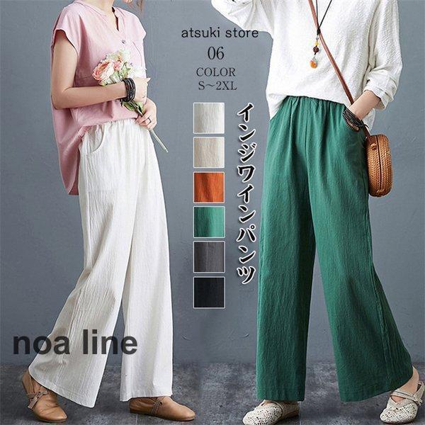 ワイドパンツ パンツ レディース ワイド 春 きれいめ 低身長 コットン リネン ウエストゴム 楽ちん 大きいサイズ ゆったり カジュアル グリーン 高発色
