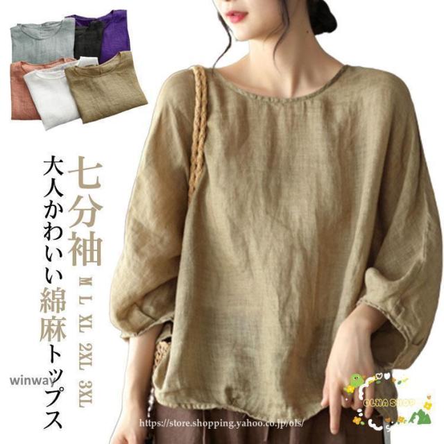 ブラウス 七分袖 シャツ レディース バルーン袖 綿麻 トップス 夏春 薄手 ふんわり おしゃれ ショート丈 ナチュラル 通勤 通学 クルーネック き