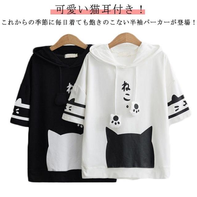 プルオーバー パーカー 大きいサイズ 春 夏 薄手 フード付き 猫耳付き 半袖 レディース メンズ 可愛い トップス 白 ねこ 猫柄 プルオーバー 夏