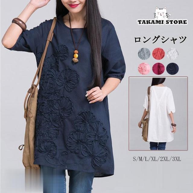 ブラウス レディース チュニック シャツ 夏 5分袖 刺繍 体型カバー Aライン 綿麻混 ゆっとり ラウンドネック 大きいサイズ 無地 カジュアル 20代 0代 40代 50代