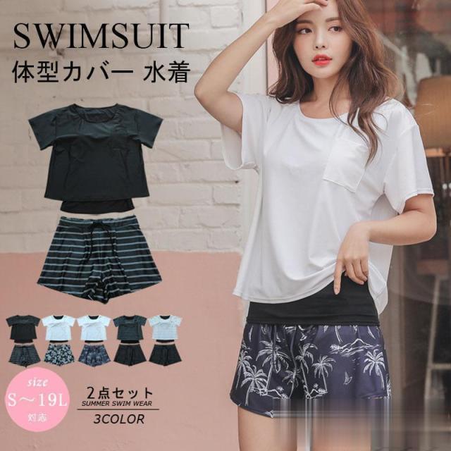水着 レディース カバーアップ水着 体型カバー タンキニ 2点セット ラッシュガード 半袖 大きいサイズ セット水着 ママ水着 短パンつき 花柄 ボーダー柄