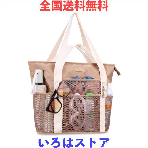 バッグの大きさ ビーチタオル、オムツ、砂遊び用おもちゃ、スナック、着替えなどをゆったりとしたメインコンパートメントに入れ、サンブロック、ビーチサンダル、傘など、外側の7つのメッシュポケットにすぐに取り出したいものを収納できます。4つのゴムリングはサングラス、鍵、帽子を掛けるのに便利。内側には防水PVCジッパーポケットがあり、携帯電話、財布、ジュエリーなどの貴重品を収納できます。