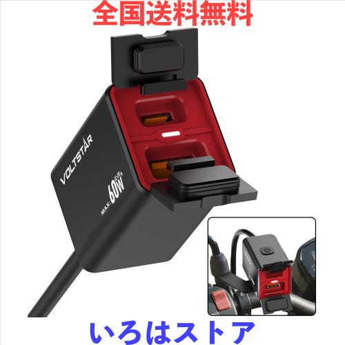 【革新型・60W急速充電】 VOLTSTAR バイク用USB電源 IPX6防水 金属製筐体 Type-C 30W+USB-A 30W 2ポート PD/QC3.0/PPS対応 DC12V〜24V対