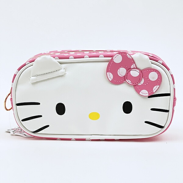 キティちゃんのフェイスデザインのペンポーチです!側面は派手なドット柄。ドット以外にリボンやキティちゃんが隠れていてとってもキュート♪しっかりした生地感でマチもあるので、メイクポーチとしても使っていただけます!チャックもリングで開けやすい◎