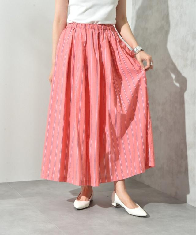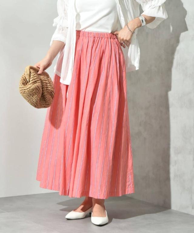 夏にぴったりな明るいカラーストライプが目を惹き、着こなしにメリハリのある大人なアクセントをプラスしてくれるスカートです。肌さわりの良いコットン素材で仕上げられ、フレアーの分量やシルエットにこだわりました。ウエストはゴム仕様でストレスフリーに着まわせ、トップスをINしてバランス良くスタイリングできる着丈も嬉しいポイントです。