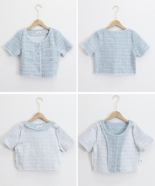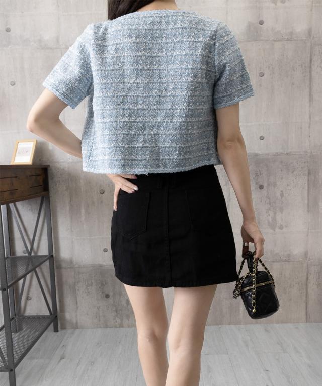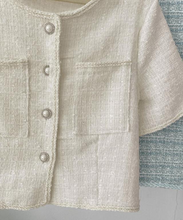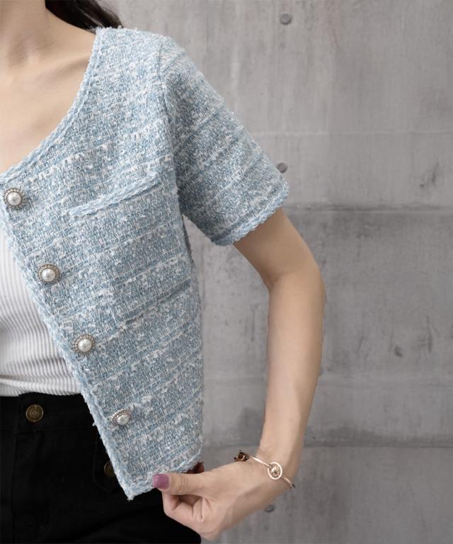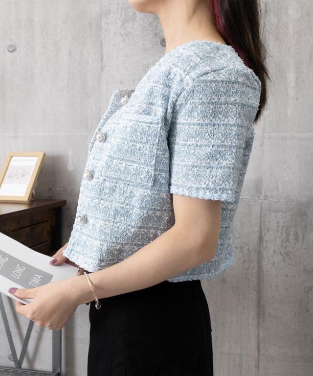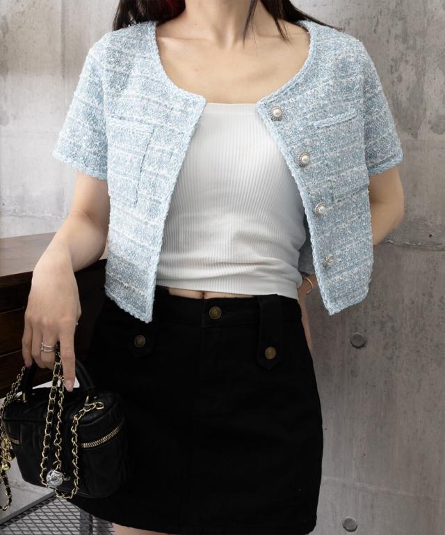 立体感のあるツイード風の素材に、ほんのりラメを織り交ぜた華やかなショートジャケット。