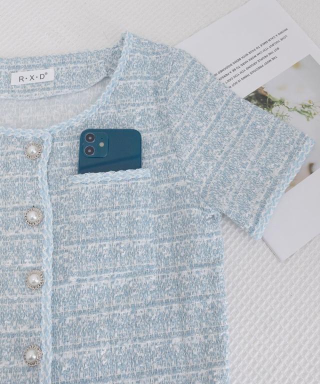 パールボタンとノーカラーデザインが、大人フェミニンな雰囲気を演出。