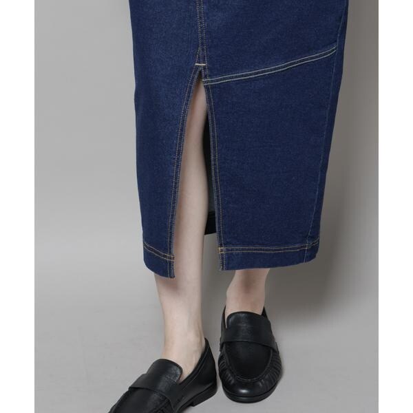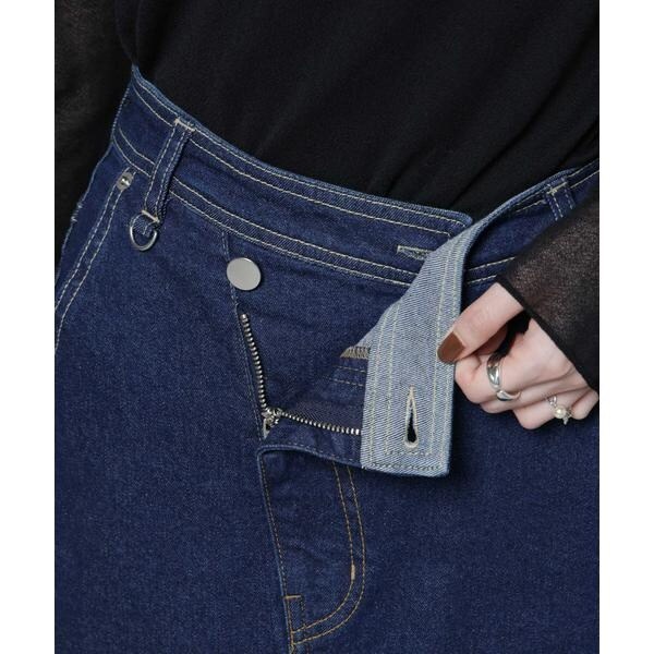 デニム素材ながらエレガントなシルエットを実現したスカート。パンツをリメイクしたようなデザインが特徴で、斜めに交差する前合わせスリット、アシンメトリーな切り替えがモードでカジュアルな印象を与える一枚です。