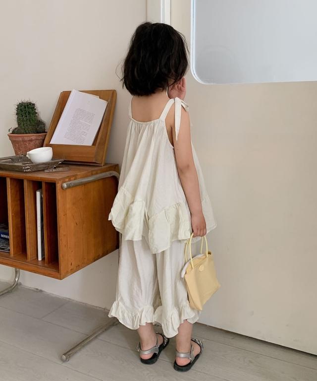 やさしく揺れるフリルが印象的な、ガーリー感たっぷりのセットアップ。軽やかな素材感とゆったりとしたシルエットで、お子さまの可愛らしさを引き立てながら快適な着心地を叶えてくれる一着です。