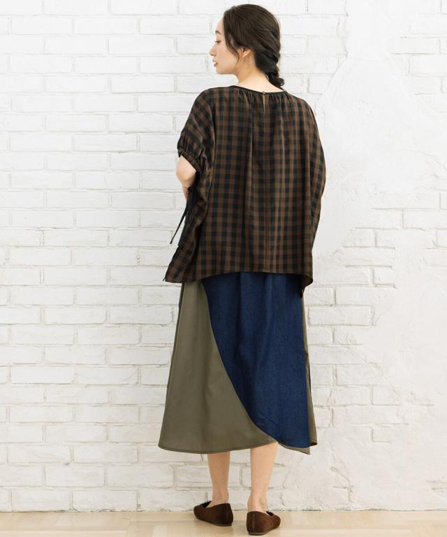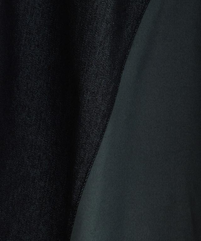 デニムと布帛の切り替えと流れるような曲線ラインが、スタイリングに動きを与えてくれます。