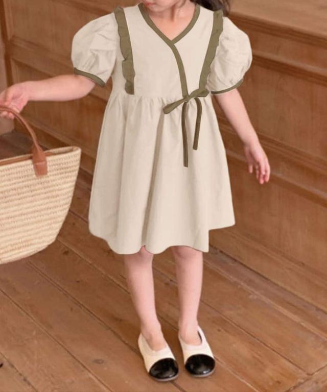 このワンピースは、Vネックデザインに配色レースのトリミングが施された、大人顔負けのおしゃれな一着です。
