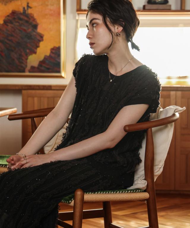 繊細な細かなスパンコールの糸と一緒に編み上げたニットアイテム。ハンドカットして作るフリンジデザインや、さりげないシアー感などこだわりが詰まった素材感。1枚で着映えするので、合わせるアイテムはシンプルで◎カジュアルにデニム合わせや、タイトスカートの着こなしもオススメです。