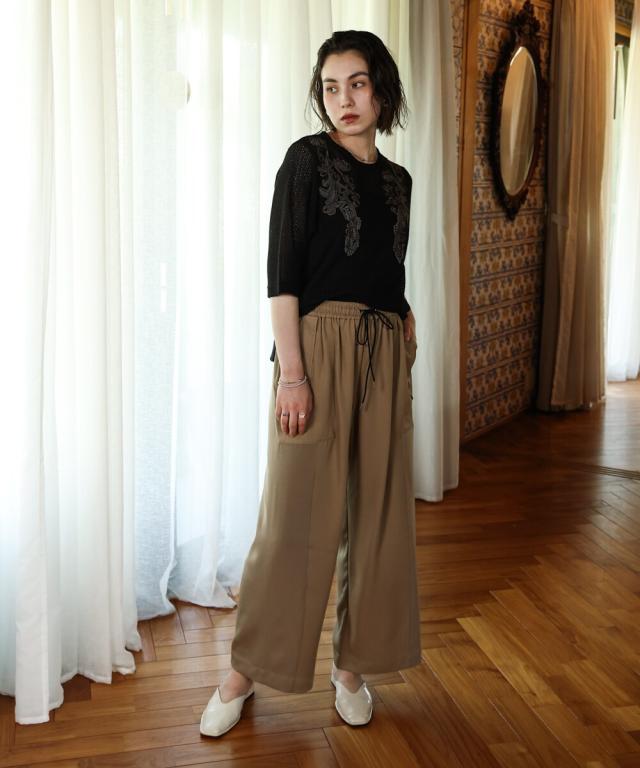 さらりとした肌ざわりと、美しい落ち感がポイント。軽やかで風通しの良い素材なので、暑い季節も快適に。光をほんのりと反射する上品なツヤが、スタイルに洗練された印象を添えてくれます。