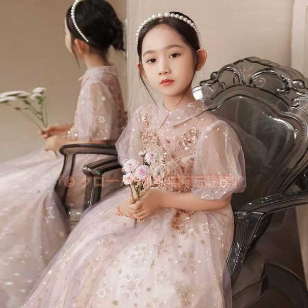 子供ドレス ロングドレス ピアノ発表会ドレス ライトパープル 女児ドレス パフスリーブ 襟付き クローバー株式会社 折り襟 可愛いドレス 女の子 入学式 卒業式 女の子