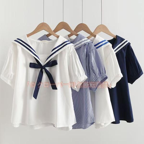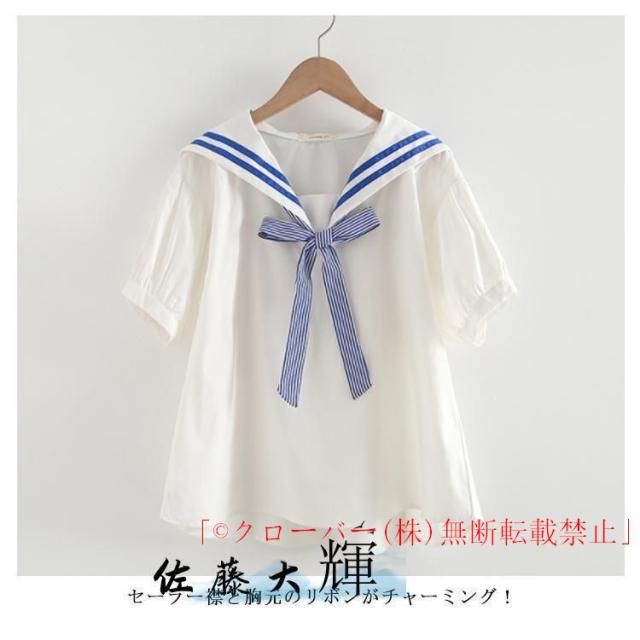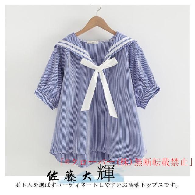 ブラウス 半袖 マリン風半袖 リボン セーラー襟 セーラーカラー プルオーバー クローバー株式会社 Tシャツ コットン 制服 学園祭 フリーサイズ 森ガール系 ゆったり