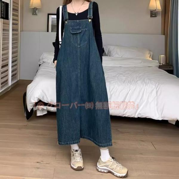 デニム ジャンパースカート レディース ロング デニム ジャンスカ オールシーズン サロペットスカート きれいめ 無地 ポケット付き 春 夏 秋 オールインワン 着