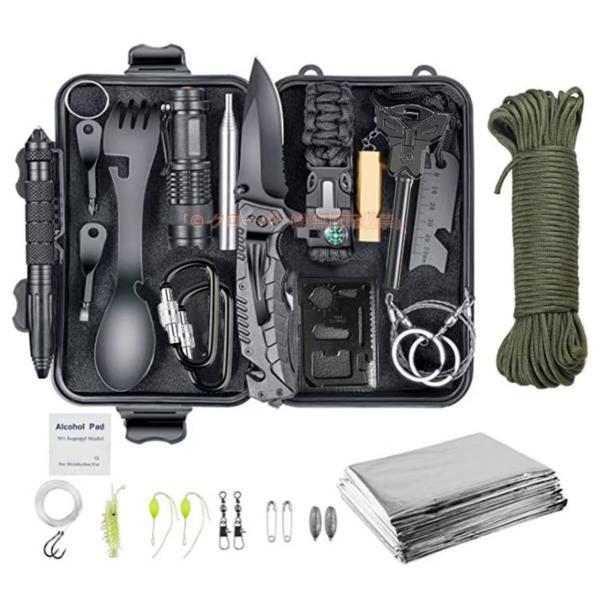 【商品内容】収納ボックス/折りたたみナイフ/多機能スプーン/タクティカルペン/多機能カード/火打石&スケール/ドライバー/LEDハンドライト(電池は別売り)/ボトルクリップ/サバイバルブレスレット/カラビナ×2/救助笛/ワイヤーソー/薬入れ/火吹き棒/サバイバルシート