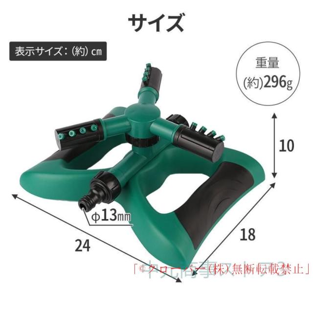 回転スプリンクラー 1個セット360°回転 全方向カバー水圧でプロペラのように360°回転しながら散水します。全方向に広範囲均等に水が撒けます。3箇所の先端ノズル、各4つの散水口先端ノズルは45°まで手動で調整できます。2つの散水モード先端ノズルの角度を変えて、散水モードを選べます。?散水口が真上→より高く遠くまで散水するモード?散水口が斜め45度→柔らかい細かな霧モード直列に複数台連結可能〔商品詳細〕商品サイズ(約):縦18cm×横24cm×高さ10cm重量(約):296gホース注水口直径:φ13mm噴霧径:2m?最大10m1個セット※コネクタは付属しておりません※水圧により散水距離と散布面積(噴霧径)は異なります