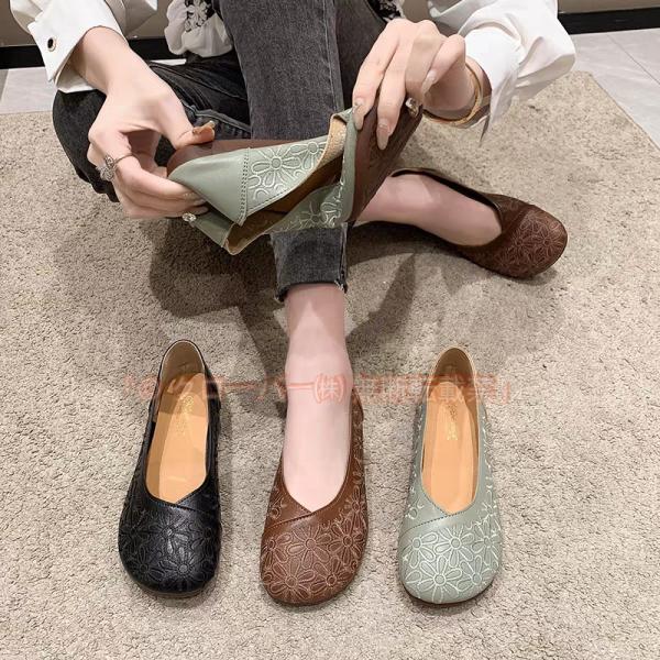 パンプス 歩きやすい レディース フラットパンプス ラウンドトゥ 痛くない シューズ ローカット レトロ 30代 40代 50代 20代 走れるパンプス フラット底 オフィス 靴 春 夏 秋 フラットシューズ ブラック ブラウン グリーン
