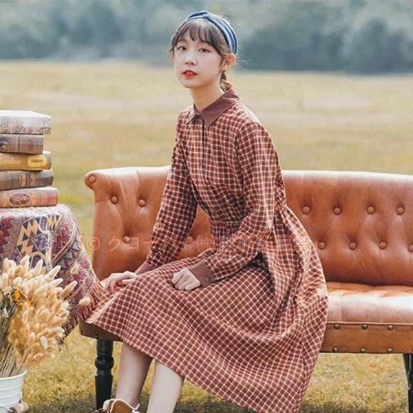 春 夏 長袖ワンピース チェック柄 ワンピース 春秋 ロングワンピ クローバー株式会社 長袖 ウエストゴム チェック柄ワンピース ロング レトロ お洒落 ドレス
