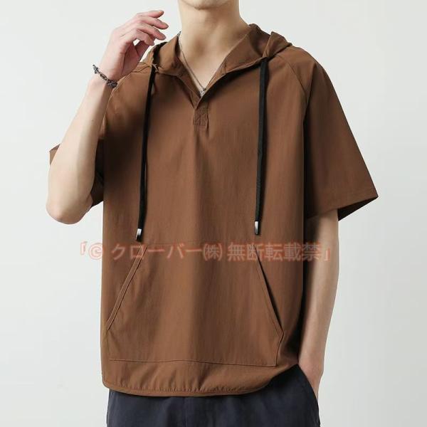 パーカー 半袖 薄手 涼しい 冷感 メンズ プルオーバー クローバー株式会社 ナイロン UVカット 5分袖パーカー Tシャツ Vネック フード付き 父の日