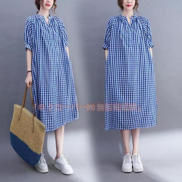 夏 ワンピース ギンガムチェック レディース 半袖ワンピース ゆったり 体型カバー クローバー株式会社 Aライン ワンピース 薄手 ロングワンピ チェック柄ワンピース