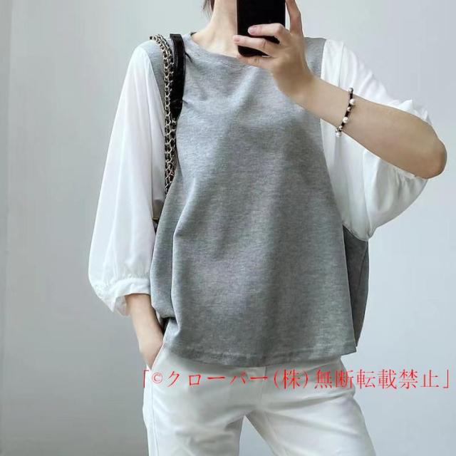 tシャツ レディース 切り替え シャツ ブラウス 無地 チェック柄 クローバー株式会社 黒 グレー 白 パフスリーブ 七分袖 長袖 トップス春物 夏 秋 丸首 20代30代40代50代