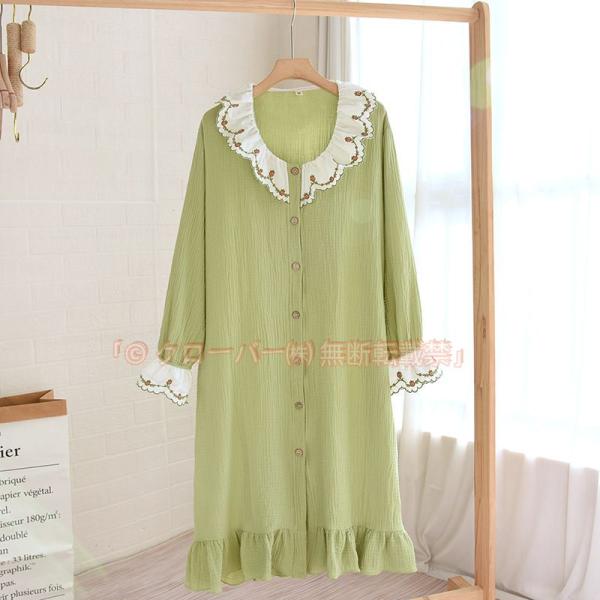 レディース パジャマ ワンピース 綿 ダブルガーゼ 前開き かわいい クローバー株式会社 フリル 春夏 長袖 部屋着 吸汗 婦人服 寝巻き 通気