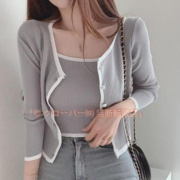 ショート丈 ニットトップス セットアップ レディース バイカラー 前開き 秋服 アンサンブル 20代30代 40代 韓国