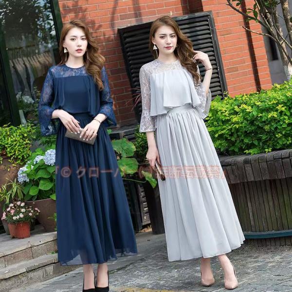 パーティードレス ワンピース フリル パーティー ドレス レース ロング クローバー株式会社 エレガント 7分袖 結婚式 二次会 お呼ばれ ラッフル ドレープ 無地 長袖