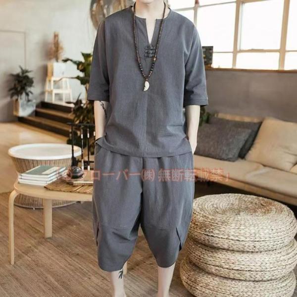 綿麻上下セット セットアップ リネン メンズ ワイドパンツ サルエルパンツ 上下 ルームウェア 半袖 薄手 Tシャツ パンツ 部屋着