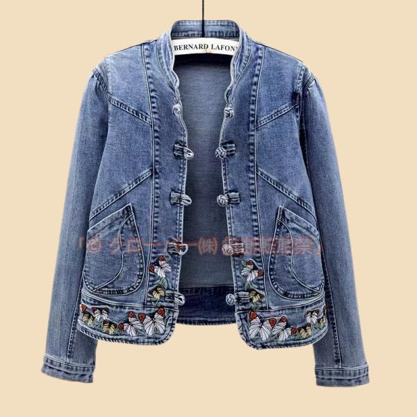 デニムジャケット 刺繍 春新作 レディースアウター エスニック系 チャイナボタン 長袖 クローバー株式会社 Gジャン 立ち襟 ジャケット ブルゾン 刺繍ジャケッ