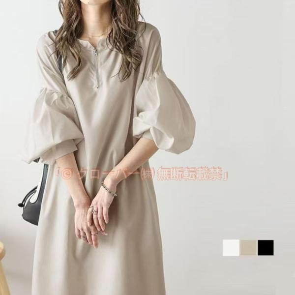 ワンピース ハーフジップワンピース レデイース ロングワンピース ボリューム袖 ハーフジップ ロング丈 クローバー株式会社 オーバーサイズ ゆったり きれいめ 大人 可愛い