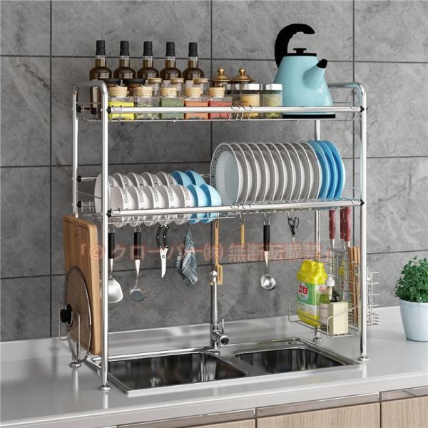 【商品仕様】サイズ:幅50cm×奥26.5×高さ62cm/82cm幅60cm×奥26.5×高さ62cm/82cm幅70cm×奥26.5×高さ62cm/82cm幅80cm×奥26.5×高さ62cm/82cm幅90cm×奥26.5×高さ62cm/82cmカラー:ステンレス、ブラック耐荷重:30kg素材:ステンレス製生産国:中国◇大容量の収納力2段式ラックなのでさまざまなキッチン用品を分類して収納できます。◇耐荷重30kgたくさん収納しても大丈夫な頑丈設計なので、安心してお使いいただけます。◇安定感のあるフレーム調節デザインで自由に調節可能。◇付属パーツ付き付属パーツは引っ掛け式なので、自由にカスタムして収納売ることができます。◇サビにくいオールステンレス製◇シンプルなデザイン※ご注文前にシンクの高さと蛇口の高さを確認してください。【関連キーワード】水切りラック 水切り 水切りかご 水切りカゴ シンク上 シンクサイド シンク横 シンクまわり ステンレス ステ
