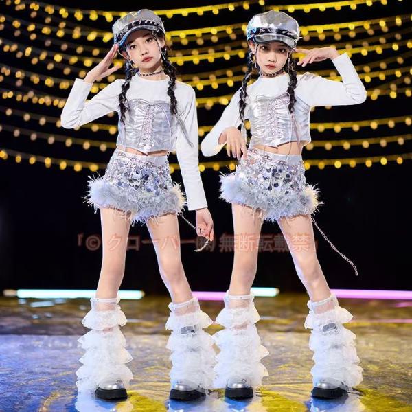 シルバー キッズダンス衣装 韓国スパンコール へそ出し キラキラ セットアップ 女の子トップス クローバー株式会社 白 ヒップホップ アイドル かっこいい k-pop 銀色 ステージ衣装