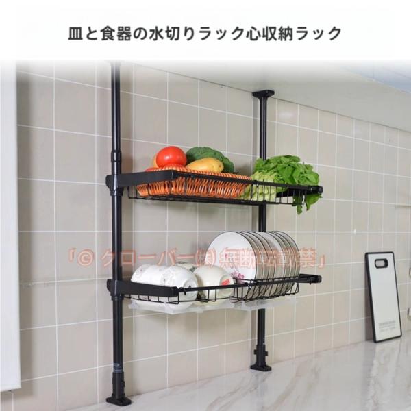 ■商品名<br>キッチンラック 突っ張りラック 水切りラック 収納 スリム おしゃれ 伸縮 ラック 2段式 水切り お皿 コップ 調味料 キッチン ブラック 固定具つき<br><br>収納場所の不足と作業スペースの狭さを同時に解決!<br>置きたい場所に合わせて幅伸縮し、収納場所と作業スペースを同時に確保できる便利ラック。<br>突っ張り式で手前に脚が出ない分、棚板下の空間も作業スペースとして有効に使えます。<br><br>■サイズ<br>縦:約68cm × 横:約62cm × 高さ:約26cm <br>■脚底サイズ 縦:約7cm×横:約4cm <br>■伸縮サイズ 約68cm~約116cm <br>■カゴサイズ ※画像参照<br>■カラー<