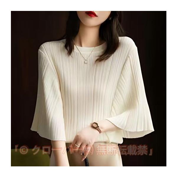 半袖サマーニット 冷感タッチ ニットブラウス 上品きれいめ ニットTシャツ オフィスカジュアル 華奢見えドルマンスリーブ