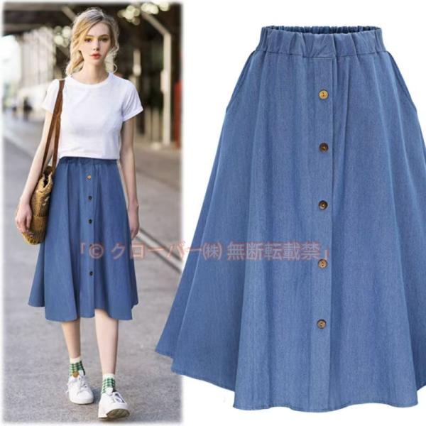 デニムスカート/レディース/ミディアムスカート/膝丈スカート/フレアスカート/フレアデニム/ウエストゴム/ボタン付き/ウォッシュ加工/ゆったり クローバー株式会社