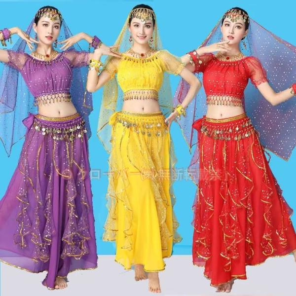 大人 アラビアン衣装 レディース ジャスミン風 ベリーダンス 衣装セット カラフル クローバー株式会社 きらきら 半袖 ショート丈トップス ロング丈 シフォン スカート ひらひらのフ