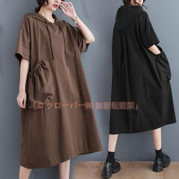 シャツワンピース 半袖 レディース ロングワンピース フード付き マキシワンピース 半袖ワンピ クローバー株式会社 Aライン ウエストゴム ロング丈 大きいサイズ ゆったり 着?せ ワ